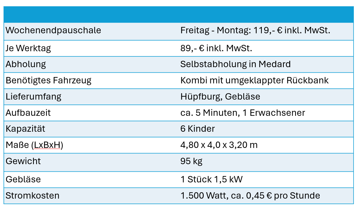 Die Einhorn Hüpfburg gehört zu unseren kompakteren Modellen. Mit 5m x 4m x 3m brauchst Du nicht viel Platz, um sie in deinem Garten oder dem Veranstaltungsort unterzubringen.